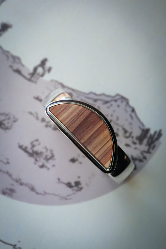 Made with handcrafted lilac wood cabochons set in reclaimed sterling silver. The raw lilac wood was processed start to finish by hand cutting, sanding, and polishing. No oils or finishes have been adding to the wood so as not to diminish the unique lilac coloring. Over time the wood will naturally darken. Do not get the wood wet.