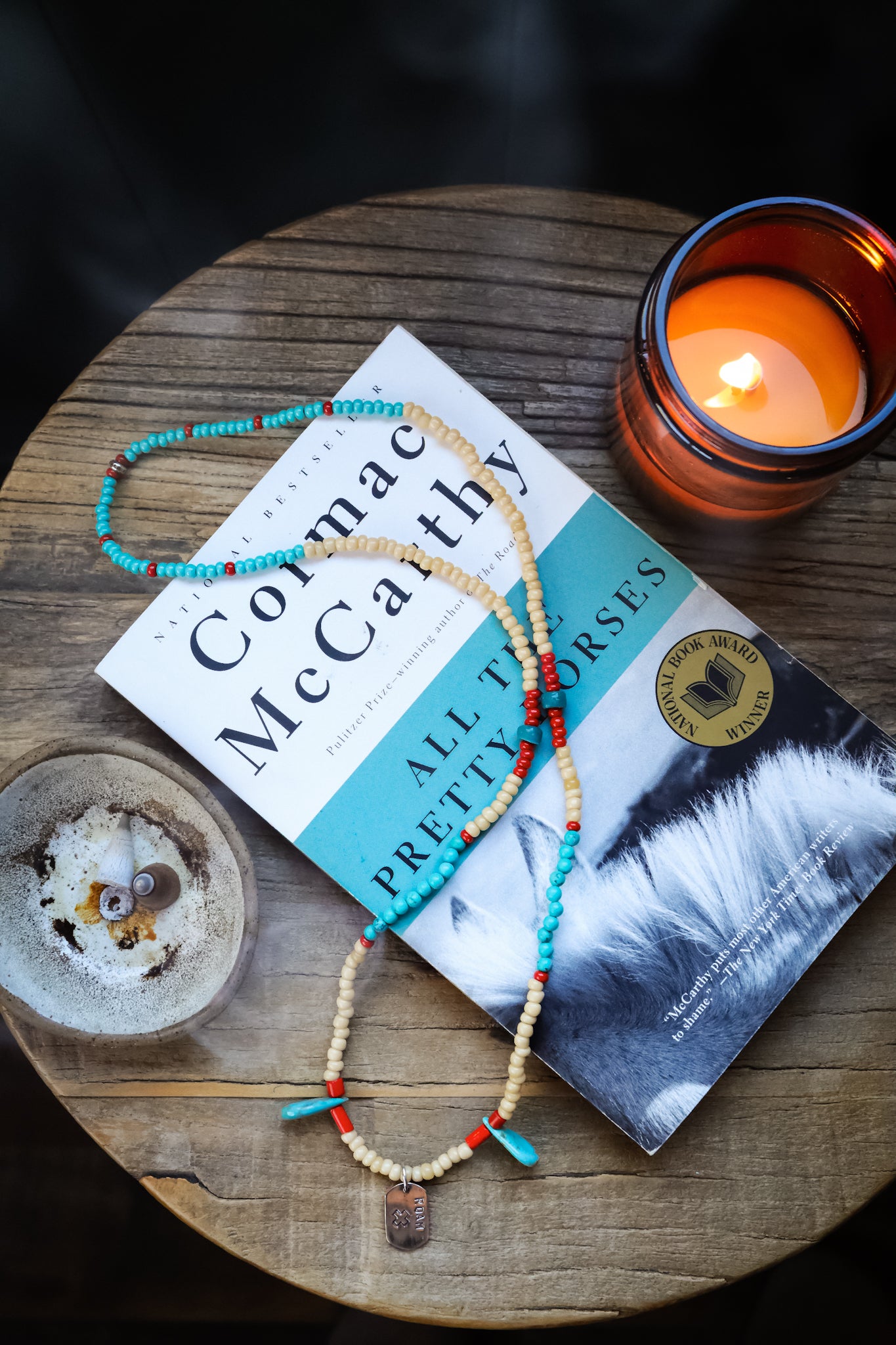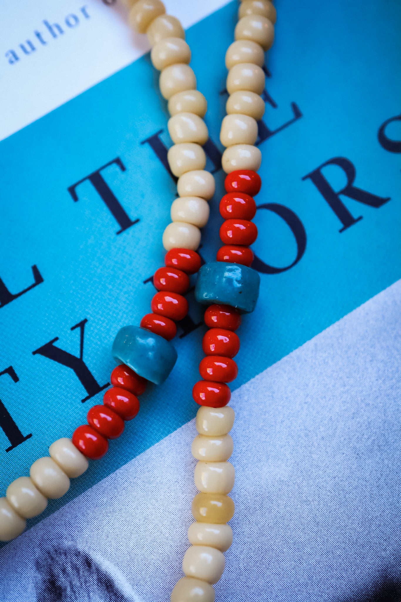 *** This is the original prototype dog tag pendant I made for the Roam Collection. It has been lightly worn, just enough to give it a little bit of that vintage flavor you find in well worn pieces. I will leave adding the rest of the patina up to you. It has been touched up and polished, but I left some smalls signs of wear that give this piece character. I re-imagined this original piece with an hand beaded strand of cream, turquoise, and red Czech glass beads with a mixture of Italian glass and turquoise stone accent beads. Two larger Royston turquoise teardrop beads accent the sterling silver pendant. Strung on heavy duty waxed thread and closed with a waxed knot under a handcrafted reclaimed sterling silver bead.